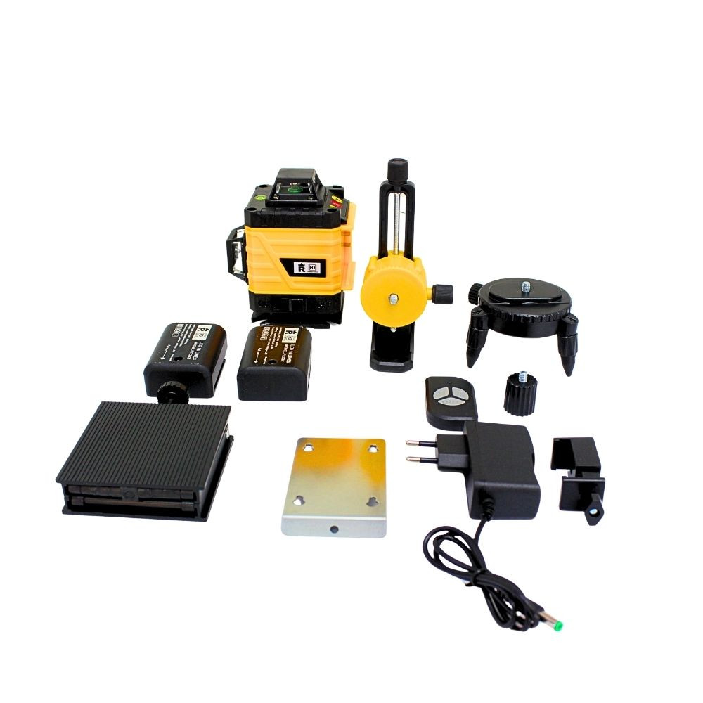 Nivel láser R HD 3D-4D en kit profesional con múltiples accesorios para montaje y ajuste fino. En las fotos se observan el equipo principal, base de microajuste con patas, soporte de pared regulable, dos baterías recargables, cargador, control remoto, placa metálica y adaptadores, todo organizado en maletín rígido. Ideal para alineación y nivelación en instalaciones, terminaciones, colocación de cerámicos y trabajos de interiores. Manual visible “MAXLIGHT Laser Level Meter 3D-4D”. (Verificar color del láser, alcance, precisión y autonomía.)