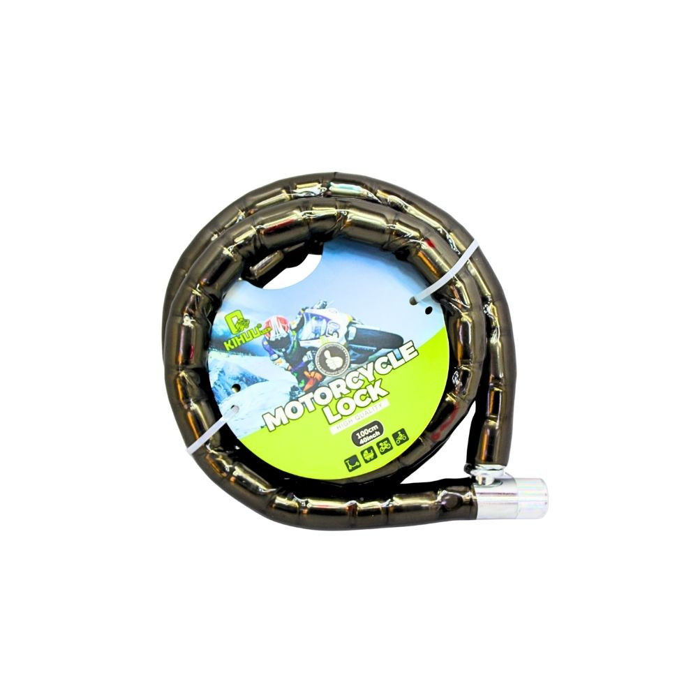 Cadena blindada para motocicleta con recubrimiento protector que evita rayones en el vehículo. El set incluye cuerpo de cierre y llaves (según empaque), ofreciendo un sistema práctico para asegurar motos, bicicletas, rejas o portones. El diseño articulado dificulta el corte y permite rodear postes o llantas con facilidad. Etiqueta “Motorcycle Lock”; largo aproximado 1,0 m y grosor reforzado (ambos a verificar). Ideal para uso diario en estacionamientos, talleres y domicilios, aportando un nivel adicional de seguridad y disuasión.
