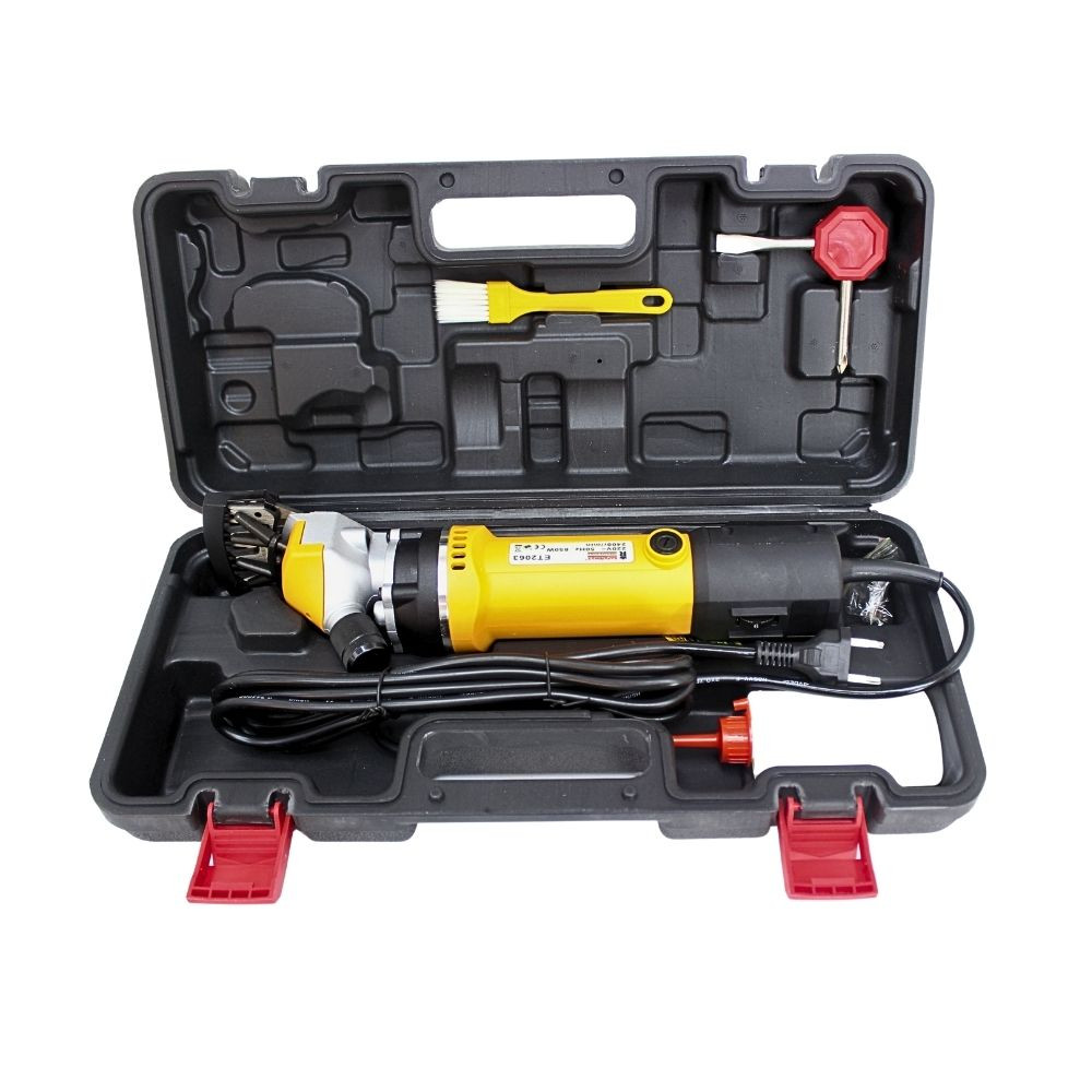 Esquiladora eléctrica para ovinos con cuerpo robusto y empuñadura antideslizante. Cabezal metálico con peines/cuchillas tipo clipper para un corte rápido y parejo del vellón. Incluye maletín rígido para transporte y guardado, cepillo de limpieza, llave/útil de mantenimiento y frasco dosificador. Ideal para ovejas (aplicable también a alpaca y llama) y trabajos de campo continuos. Alimentación 220V
