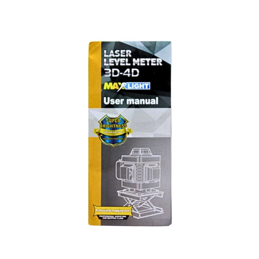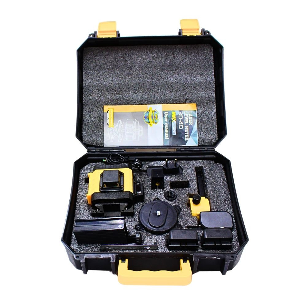 Nivel láser R HD 3D-4D en kit profesional con múltiples accesorios para montaje y ajuste fino. En las fotos se observan el equipo principal, base de microajuste con patas, soporte de pared regulable, dos baterías recargables, cargador, control remoto, placa metálica y adaptadores, todo organizado en maletín rígido. Ideal para alineación y nivelación en instalaciones, terminaciones, colocación de cerámicos y trabajos de interiores. Manual visible “MAXLIGHT Laser Level Meter 3D-4D”. (Verificar color del láser, alcance, precisión y autonomía.)